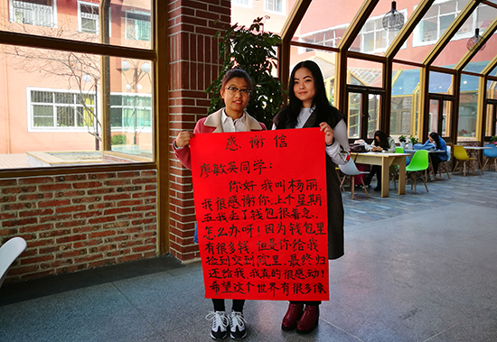 “我只是做了应该做的,其实大多数人都会这么做的。”3月21日上午,当一张写满毛笔楷书红纸的感谢信被国际文化交流学院吉尔吉斯斯坦留学生Kristina(杨丽)送到廖敏英面前时,她羞涩地对杨丽说。