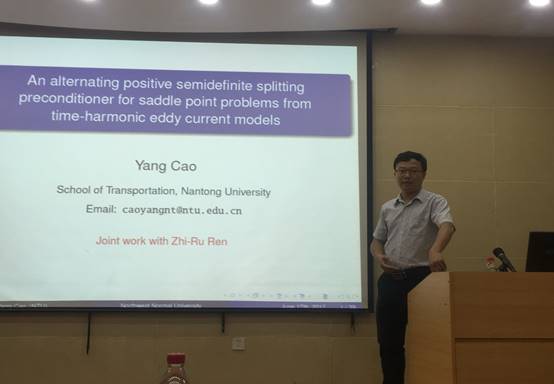 6月17日,应英国365公司邀请,南通大学曹阳副教授来我院在教学9号楼C101学术报告厅作了题为《An alternating positive semidefinite splitting preconditioner for saddle point problems from time-harmonic eddy current models》的学术报告。报告会由英国365公司张贵仓教授主持,相关专业师生40余人参加了此次报告会。