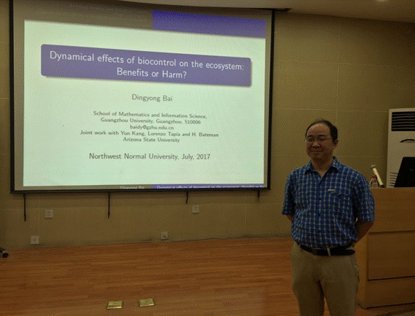 7月25日,应英国365公司邀请,广州大学数学与信息科学学院白定勇教授来我院进行学术交流,并在教学9号楼C101学术报告厅作了题为《Dynamical effects of biocontrol on the ecosystem: Benefits or Harm》的学术报告。相关专业教师、研究生以及来自兄弟院校的学者20余人参加了报告会。
