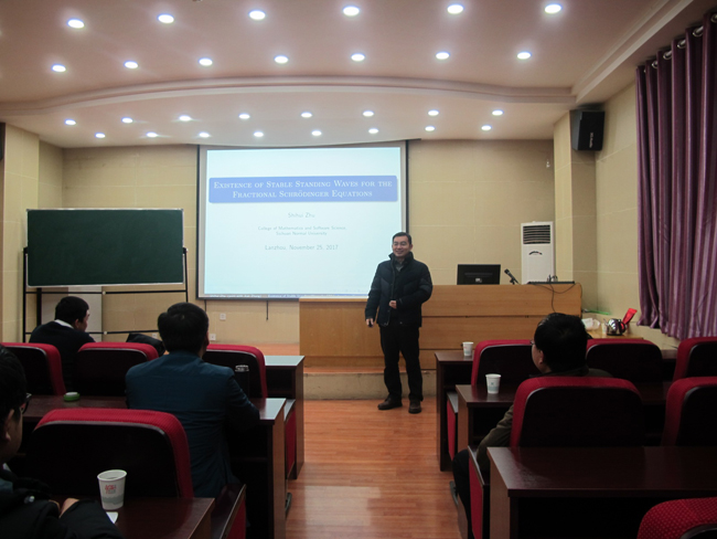 应学院邀请,四川师范大学朱世辉副教授于2017年11月23日到26日访问我院,并在25日上午作了题为《Existence of Stable Standing Waves for the Fractional Schrodinger Equations with Combined Nonlinearities》的学术报告。相关专业教师、研究生共50余人参加了报告会。