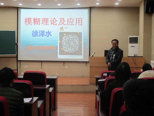 徐泽水教授在第一场报告中,主要系统介绍了模糊理论的起源和意义,以及模糊理论在医学、气象、心理、经济管理、石油、地质、环境、生物、农业、林业、化工、控制、遥感、教育、体育等诸多方面的应用。在第二和第三场报告中,徐泽水教授重点介绍了直觉模糊数理论和犹豫模糊决策方面的最新研究方向和进展,最新的具体研究方向包括直觉模糊信息集成、直觉模糊层次分析法、动态直觉模糊决策、直觉模糊聚类方法、直觉模糊积分、犹豫模糊信息集成、犹豫模糊聚类方法、犹豫层次分析法等。在第四场报告中,徐泽水教授结合自己的研究经历,以及目前指导整个研究团队的经验,从论文选题,到写摘要,组织正文,选择参考文献等诸多方面,娓娓道来,对撰写高质量研究论文给出了非常重要的、具有很强指导性的意见,使得在场师生,特别是研究生同学受益匪浅。