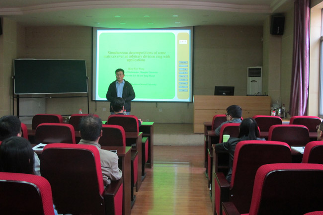 3月29日,应学院邀请,上海大学博士生导师王卿文教授来我院进行学术交流。王卿文教授在教学9号楼C101学术报告厅作了题为《Simultaneous decompositions of some matrices over an arbitrary division rings with applications》的学术报告。报告会由英国上市365校长刘仲奎教授主持,相关专业师生40多人参加了报告会。