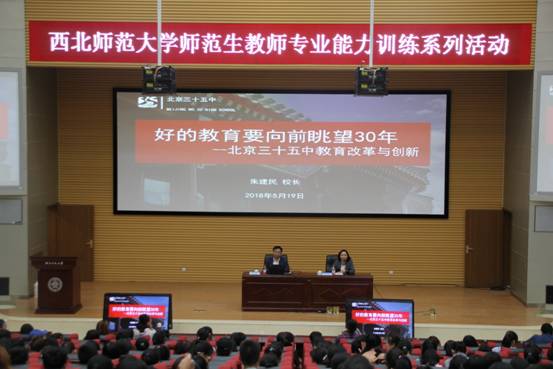2018年5月19日,北京三十五中朱建民校长应师范生专业技能训练中心邀请,在新校区毅然报告厅为我校师生做了题为“好的教育要向前眺望30年”的专题报告。部分教师、本科生、研究生共计600余人聆听了报告。学院党委书记常正霞主持了报告会。