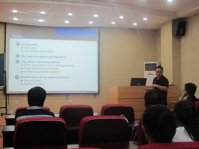 6月25日,应学院邀请,上海师范大学王荣年教授来我院在9号楼C101学术报告厅作了题为《Invariant manifolds and reduction principle for dissipative PDEs》的学术报告。报告会由杨和副教授主持,相关专业师生20余人参加了报告会。