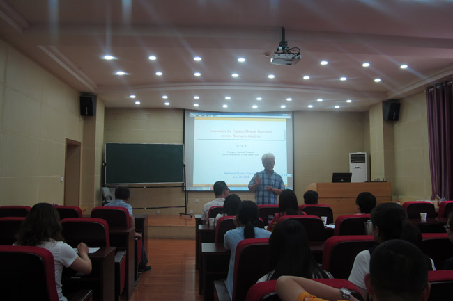 6月26日,应学院邀请,韩国国立中北大学(Chungbuk National University) 博士生导师Un Cig Ji教授应邀来我院作学术交流,并在9号楼C101学术报告厅作了题为“Inequalities for Positive Module Operators on von Neumann Algebras”的学术报告。报告会由王才士教授主持,相关专业师生30余人参加了报告会。