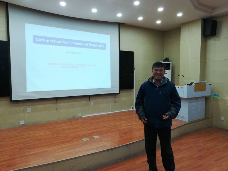 陈建龙教授的报告谈到了矩阵环上关于矩阵的core和对偶core逆,详细地讲解了一般环上元素的core和对偶core逆的定义及背景,并将环上元素的core和对偶core逆进一步推广到满足对合性质的加法范畴的态射的情形下。最后,给出了相关结果在一些具体领域下的应用。