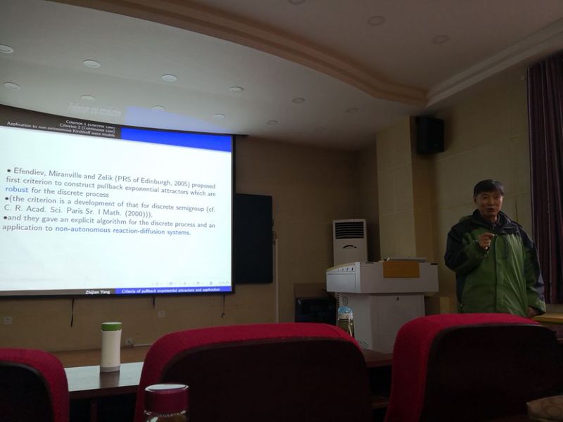 报告中,杨志坚教授讲解了非自治动力系统的拉回吸引子和拉回指数吸引子的基本概念,并且证明了拉回指数吸引子在小扰动下的可控性。然后,针对离散动力系统和连续动力系统,分别介绍了拉回指数吸引子存在性和稳定性的准则。进一步,将该准则应用于具有结构阻尼和超临界非线性的非自治基尔霍夫波方程,构造了一类拉回指数吸引子,该吸引子在扰动情形下是稳定的。