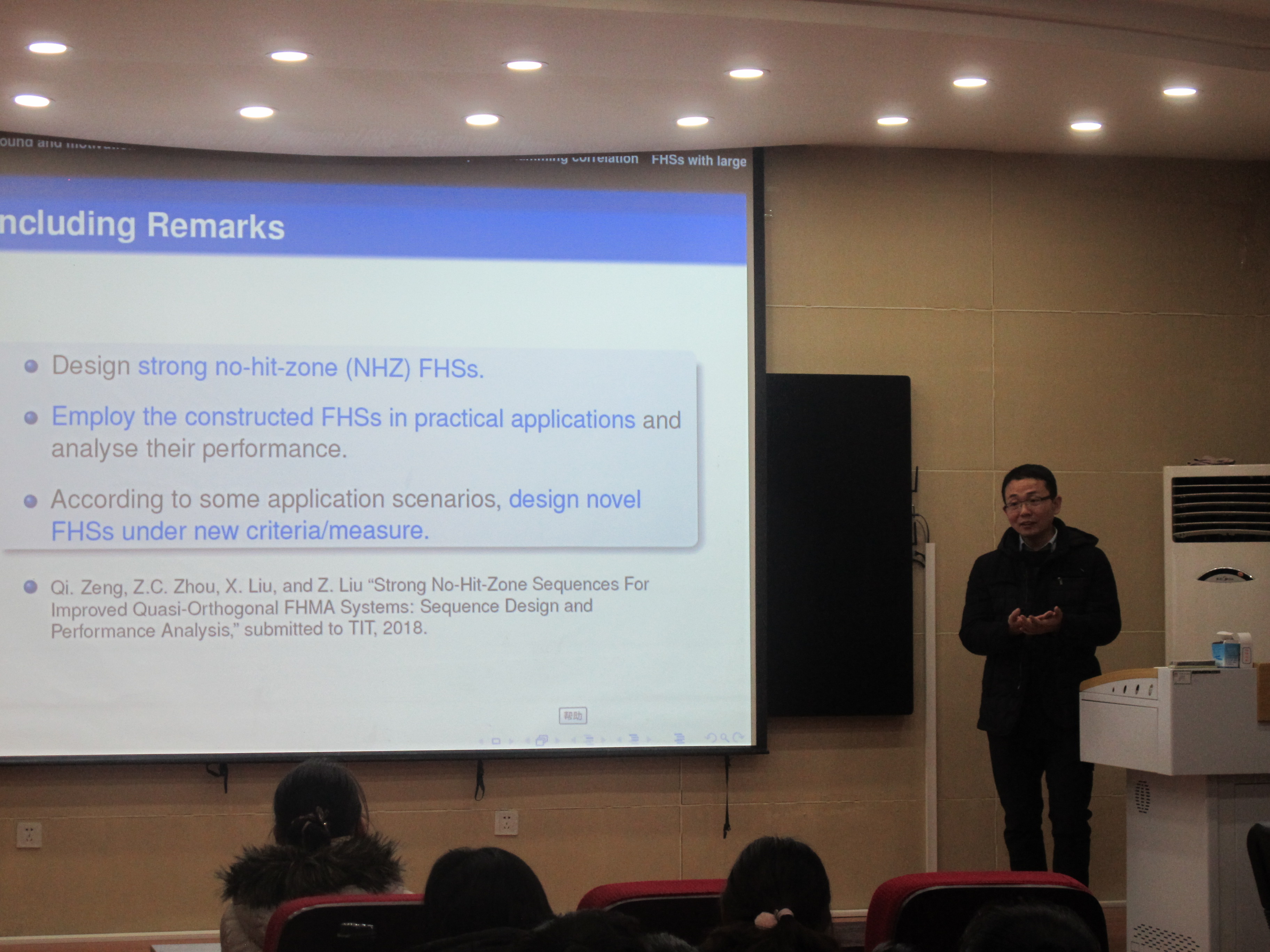 报告中,周正春教授介绍了跳频理论的研究背景,给出了序列三种相关性的概念,并就如何找到不同参数之间的折中分享了自己的见解,最后提出了一些可供学习和研究的方向。