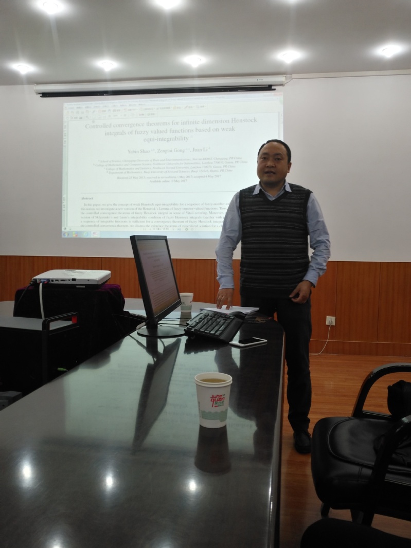 3月21日,应学院邀请,重庆邮电大学理学院邵亚斌教授来我院作了题为《时滞型模糊泛函微分方程与非绝对模糊积分》的学术报告。报告会由巩增泰教授主持,相关专业师生30余人参加了报告会。