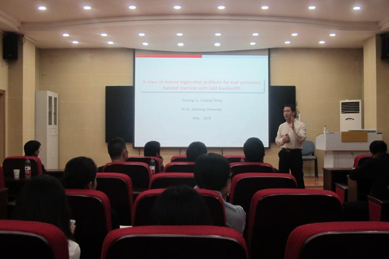 5月17日,应学院邀请,西安交通大学李继成教授来院作了题为《A class of inverse eigenvalue problems for real symmetric banded matrices with odd bandwidth》的学术报告。报告会由缪树鑫副教授主持,相关专业师生约40余人参加了报告会。