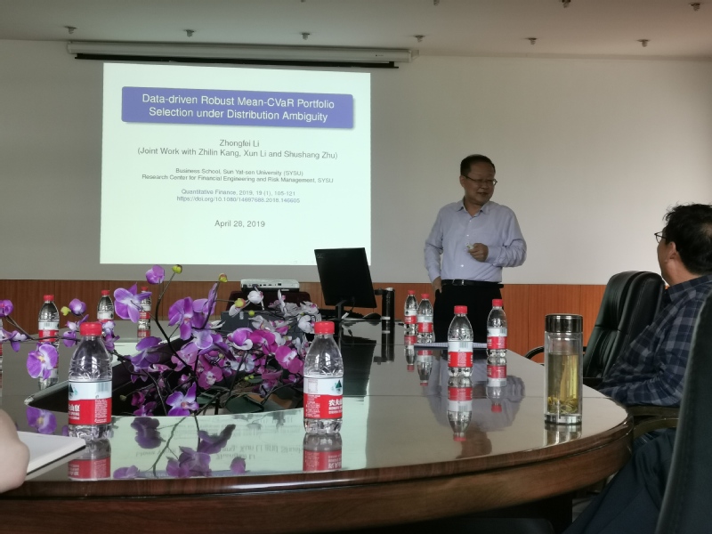 5月21日,应学院邀请,中山大学管理学院教授、博士生导师李仲飞教授在教学9号楼C311做了题为“数据驱动和分布不确定下的鲁棒投资组合选择”的学术报告。报告会由学院颜荣芳教授主持,相关专业师生40余人参加了报告会。
