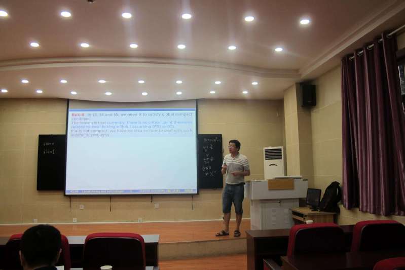 刘轼波教授主要汇报了Morse理论以及局部环绕在带不定位势的薛定谔方程中的应用。他首先简单介绍了Morse理论以及局部环绕定理,然后详细介绍了他们应用Morse理论以及局部环绕在带不定位势的薛定谔方程解的存在性等方面的工作,最后介绍了Morse理论以及局部环绕的优缺点以及还未解决的问题。报告结束后,刘轼波教授就与会师生提出的相关问题作了解答。