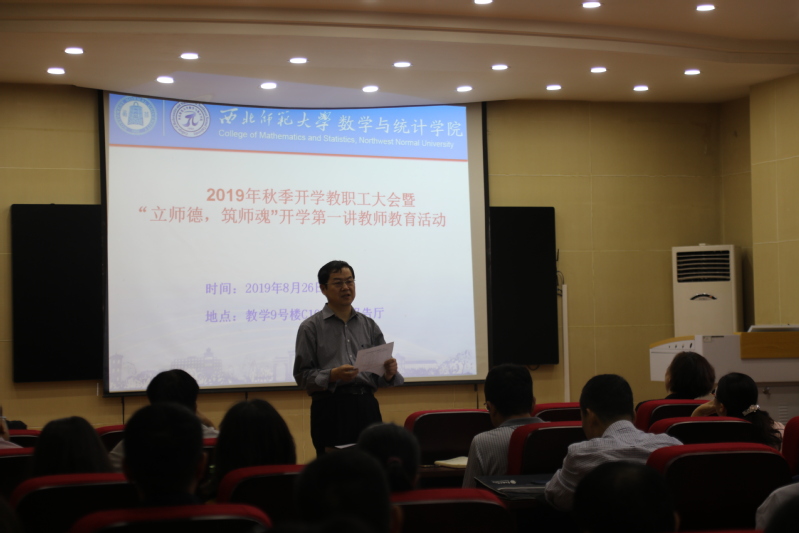 会上,常正霞书记传达了习近平总书记到甘肃视察的重要讲话和指示精神及学校近期下发的重要文件精神,李永祥院长传达了8月24日学校2019年秋季学期工作安排会议精神,结合学校2019年下半年重点工作对我院下半年工作做了总体安排部署。刘建成副院长就新学期本科教学工作进行了安排部署,对数学与应用数学(师范)专业培养方案修订情况做了说明。张贵仓副院长、王玮副书记、安燕副院长分别就研究生教学、学生管理、学院行政内务等方面工作做了通报和安排。