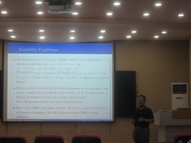 9月4日,应学院邀请,北京大学冯荣权教授在9号楼C101学术报告厅作了题为《Directed Strongly Regular Dihedrants》的学术报告。报告会由乔虎生教授主持,相关专业师生约35人参加了报告会。