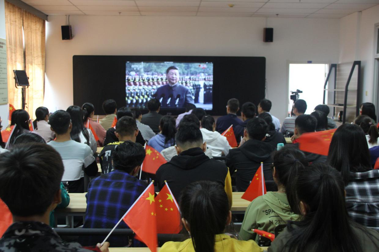 红日东升光芒万丈,五星红旗迎风飘扬。10点整,阅兵仪式正式开始,大家聚精会神、专注聆听习近平总书记的重要讲话,并观看阅兵式实况。阅兵现场磅礴盛况,振奋人心。一支支威武的受阅部队,一排排精良的军事装备,阵容强大、气势恢弘。每每看到受阅方阵迈着铿锵有力的步伐通过天安门广场,收看实况的师生心潮澎湃、激动万分,为祖国的强大和富强感到由衷的骄傲与自豪,同时,广大师生共祝伟大祖国繁荣昌盛,明天更加美好,他们也表示将肩负新时代的历史使命,为实现中华民族伟大复兴的中国梦而努力奋斗。