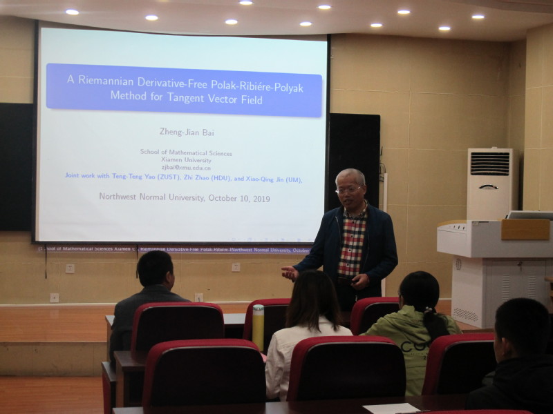 10月10日上午,应学院邀请,厦门大学白正简教授在9号楼C101报告厅作了题为《A Riemannian Derivative-Free PRP Method for Tangent Vector Field》的学术报告。报告会由缪树鑫副教授主持,相关专业师生约40人参加了报告会。