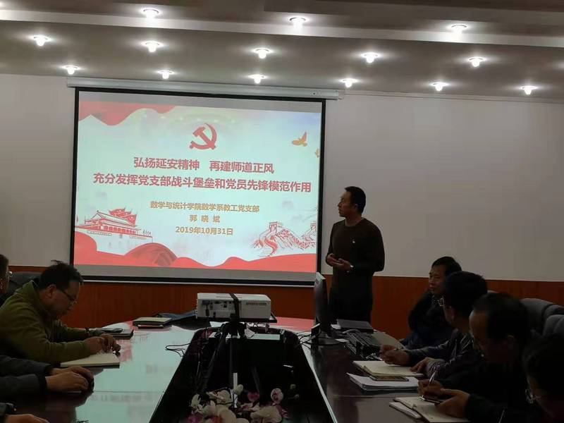 数学系教工党支部书记郭晓斌以“弘扬延安精神,再建师道正风——充分发挥党支部战斗堡垒和党员先锋模范作用”为题,结合自己暑期在延安参加培训的学习心得体会,围绕四个方面讲党课。一是什么是延安精神、延安精神的具体内涵以及新时代如何践行延安精神;二是数学系教工党支部从抓住着力点,围绕主线,突出政治引领;选好切入点,创新方式,激发支部活力;找准结合点,群体示范,实现双融双促方面所做的实践与探索;三是立德树人,爱岗敬业,充分发挥党支部战斗堡垒和党员先锋模范作用;四是在进一步用专业素养提升党建工作的内涵,增强党建工作的厚度和温度,以党建工作为源动力,充分发挥党员教师在全领域的引领作用,促进一流学科建设方面所做的思考。郭老师的讲解通过大量生动的事例,使在场教职工纷纷感恩自己生活在幸福美好的新时代,并期盼祖国取得更大进步,学校的明天更美好,学院在主题教育中取得实效。
