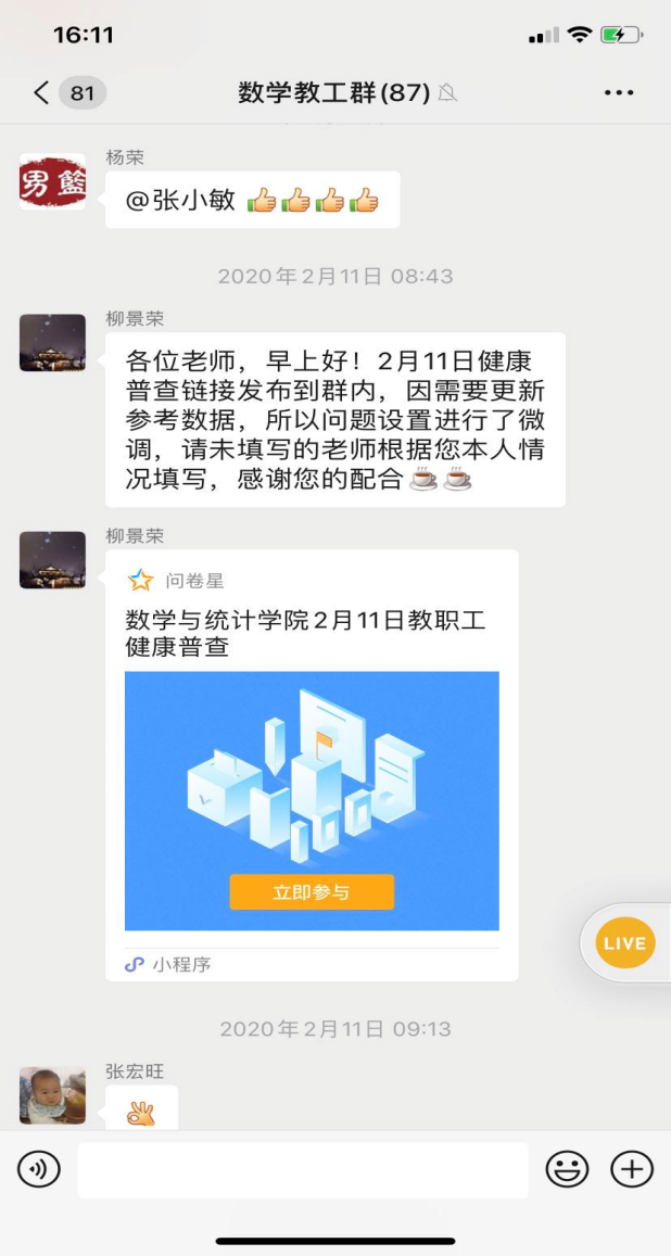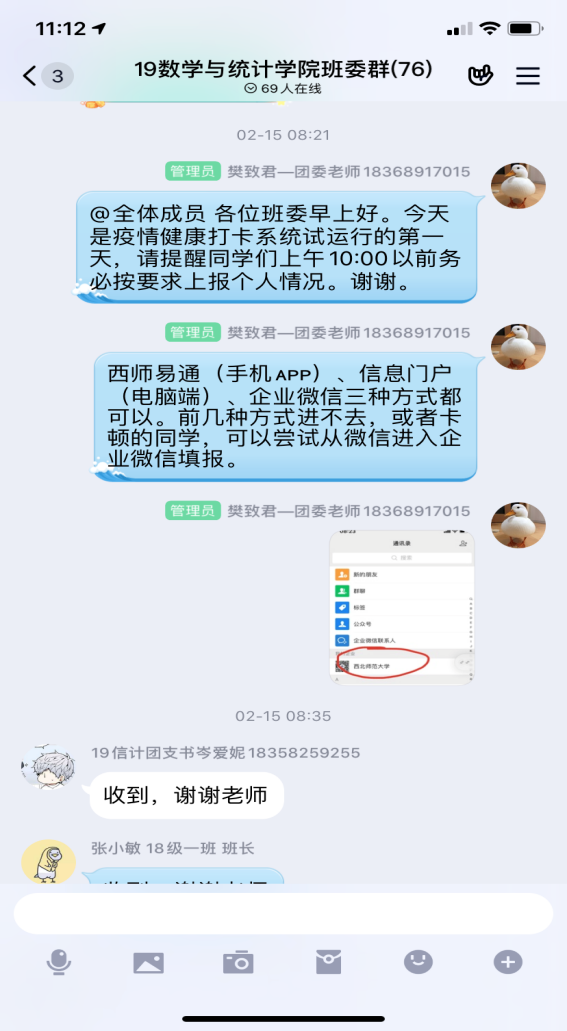 二、严格考勤,强化疫情防控报告制度。根据学校疫情防控工作要求,常正霞书记作了进一步统筹安排,严格执行疫情防控“日报告、零报告”制度,对全院师生每日进行双线排查。安燕副院长、张宏旺主任和辅导员柳景荣积极配合师大社区每日对学院80余名教职工进行健康普查和出行登记;王玮副书记、研究生秘书马成龙、辅导员樊致君、研究生导师和22位班主任每日督促学院1295名学生进行疫情日报打卡,构筑“学院领导-班主任-辅导员”三级防御模式,全面掌握学生情况,及时传达学校通知。