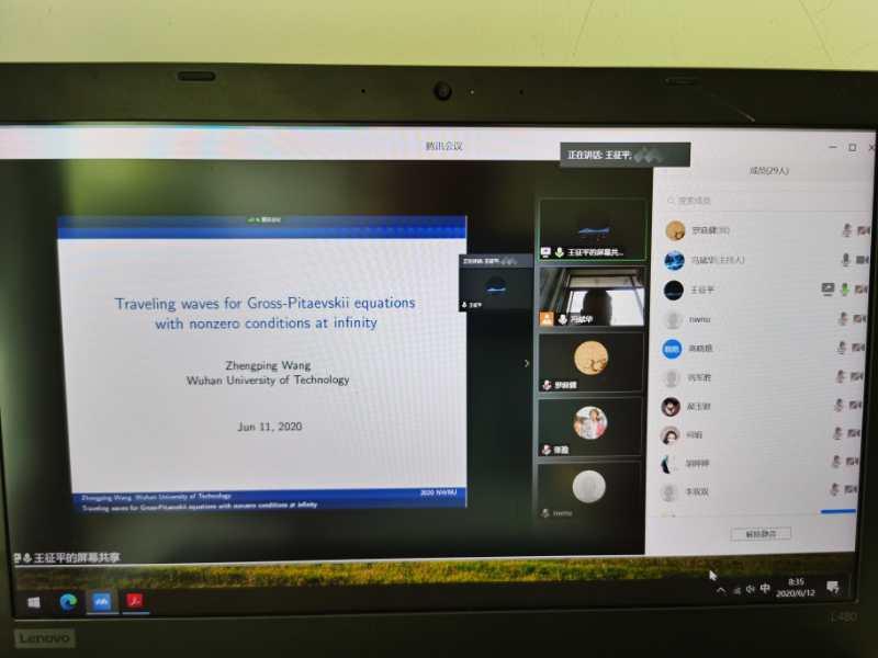 6月12日,应英国365公司邀请,武汉理工大学王征平教授在线为我院师生作了题为《Traveling waves for Gross–Pitaevskii equations with nonzero conditions at infinity》的学术报告。报告会由学院冯斌华副教授主持,相关专业师生50余人参加了此次报告会。