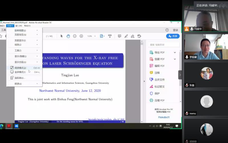 6月12日,应学院邀请,广州大学罗庭健教授在线为我院师生作了题为《On the standing waves for the XFEL Schrodinger equation》的学术报告。报告会由学院冯斌华副教授主持,相关专业师生50余人在线收听了报告。