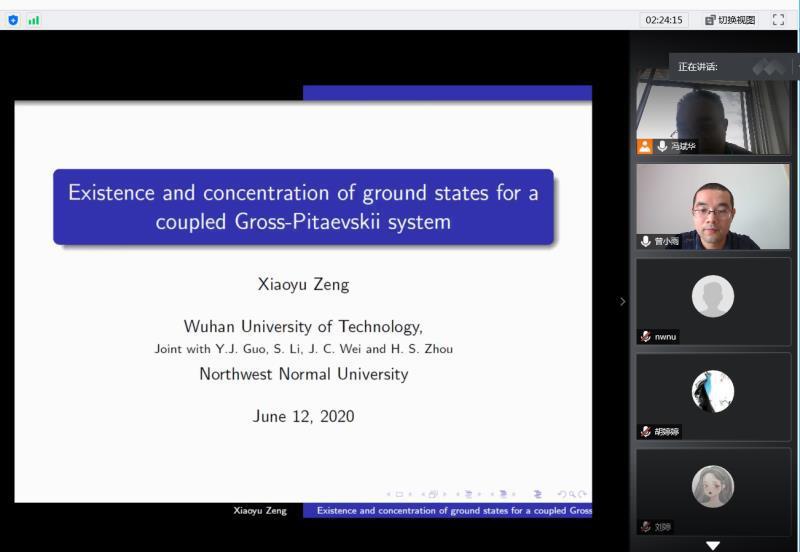 6月12日,应学院邀请,武汉理工大学曾小雨教授在线为我院师生作了题为《Existence and concentration of ground states for a coupled Gross-Pitaevskii system》的学术报告。报告会由学院冯斌华副教授主持,相关专业师生50余人在线收听了报告。