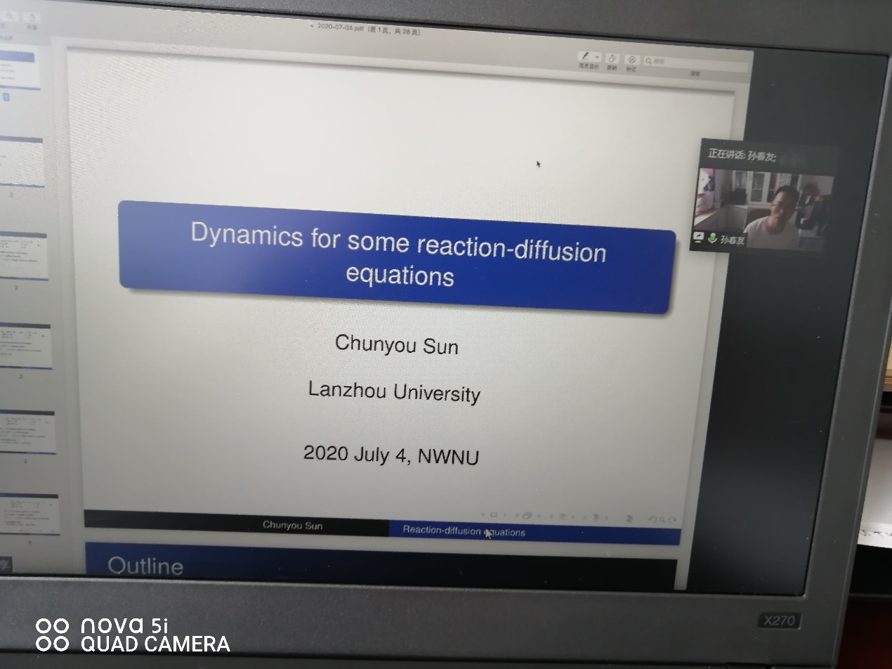 7月4日,应学院邀请,兰州大学孙春友教授在线为我院师生作了题为《Dynamics for some reaction-diffusion equations》的学术报告。报告会由学院马巧珍教授主持,相关专业师生50余人在线收听了报告。
