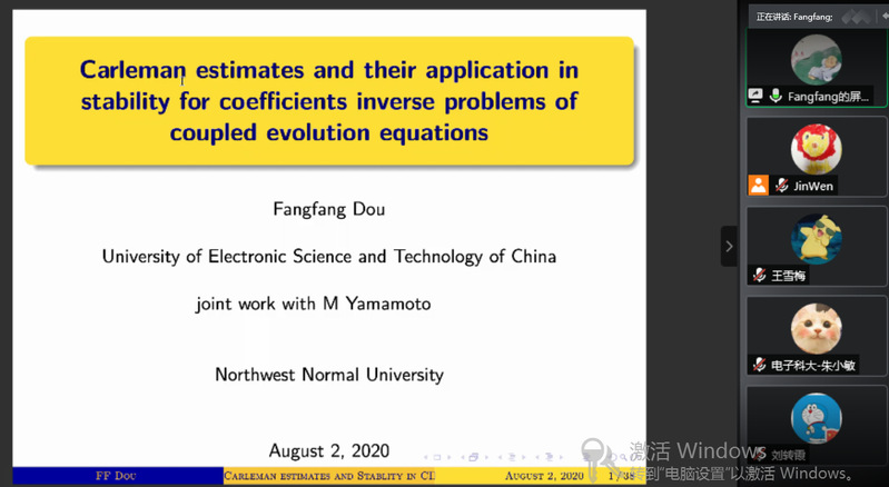 8月2日上午,应学院邀请,电子科技大学窦芳芳副教授在线为我院师生作了题为《Carleman estimates and their application in stability for coefficients inverse problems of coupled evolution equations》的学术报告。报告会由温瑾副教授主持,相关专业师生30余人参加了报告会。