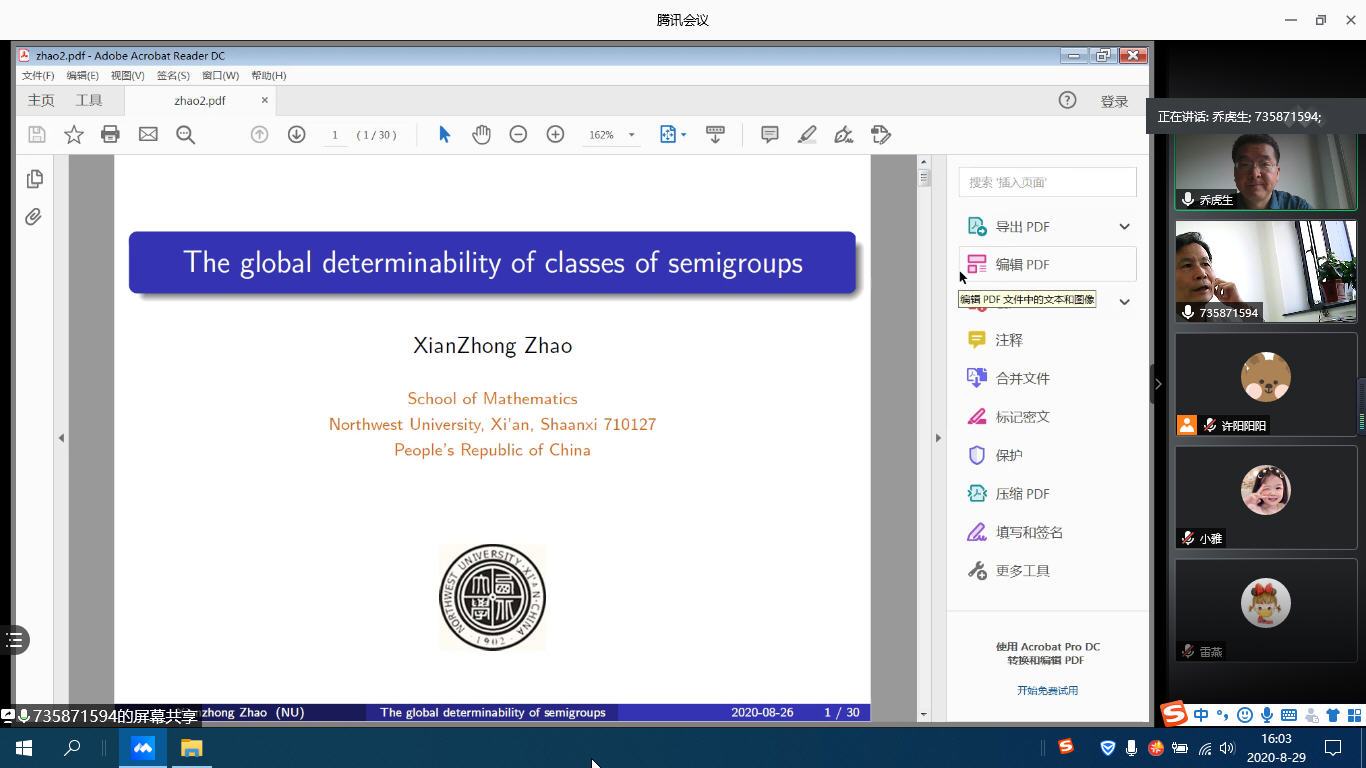 8月29日下午,应学院邀请,西北大学赵宪钟教授在线为我院师生作了题为《The global determinability of classes of semigroups》的学术报告。报告会由乔虎生教授主持,相关专业师生30余人参加了报告会。