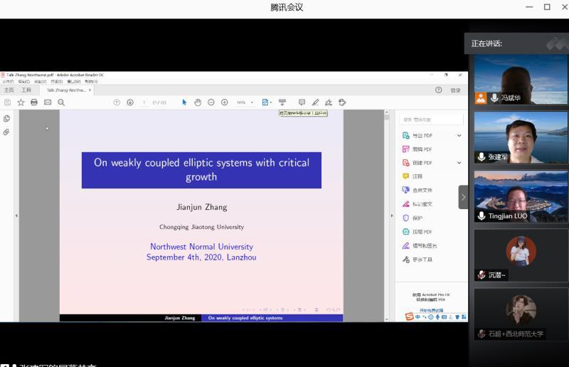 9月4日,应学院邀请,重庆交通大学张建军教授在线为我院师生作了题为《On weakly coupled elliptic systems with critical growth》的学术报告。报告会由学院冯斌华副教授主持,相关专业师生50余人参加了此次报告会。