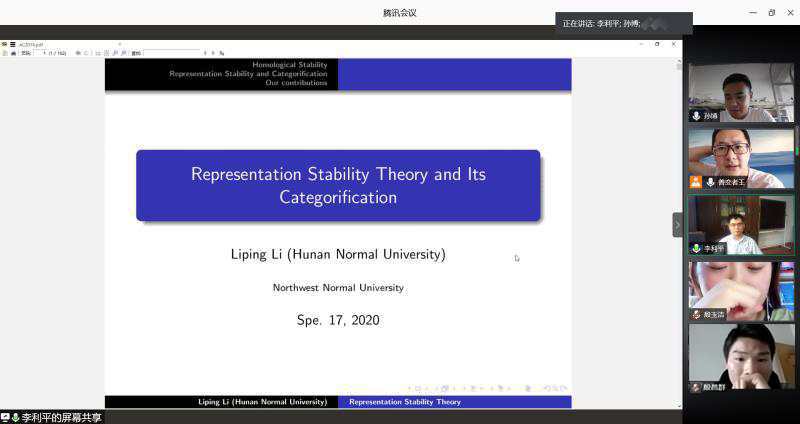 9月17日、19日和21日,应学院邀请,湖南师范大学英国365公司特聘教授李利平老师,围绕着表示稳定性理论与FI-理论,分别在线为学院师生作了题为《Representation Stability Theory and Its Categorification》、《FI-modules and Homology of Congruence Subgroups》与《Representation Stability and FI-modules》的学术报告。报告由狄振兴副教授主持,相关专业师生60余人参加了学术报告。