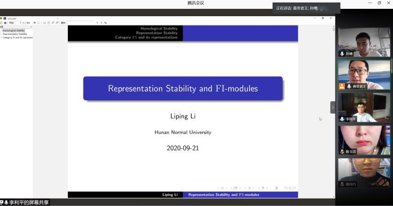 李利平教授的第一场报告从表示稳定性的理论背景讲起,谈到了用范畴化的思想对群同调的稳定性进行研究的动机,并给出了一些重要子范畴的分类刻画。李利平教授的第二场报告从提出FI-模的动机讲起,详细讲述了表示稳定性理论中的相关问题与FI-模上的相关范畴的具体联系,并阐述了借助FI-模这一工具所得到的和同余子群的同调稳定性相关的最新结果。在第三场报告中,李利平教授更为详细地列举出表示稳定性理论中的相关问题与FI-模范畴中的相关研究结果的对应关系,并对继续借助FI-模对表示稳定性进行研究的相关方面进行了展望。