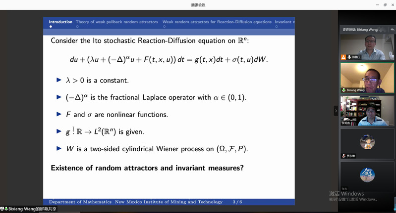 10月3日,应学院邀请,美国新墨西哥矿业与理工大学王碧祥教授在线为我院师生作了题为《Dynamics of Stochastic Reaction-Diffusion Equations Driven by Nonlinear Noise》的学术报告。报告会由陈鹏玉副教授主持,相关专业师生40余人参加了此次报告会。