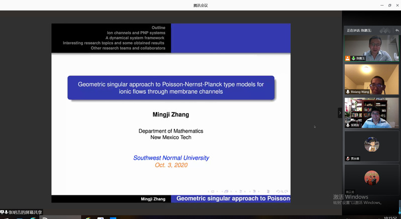 10月3日,应学院邀请,美国新墨西哥矿业与理工大学张明吉教授在线为我院师生作了题为《Geometric singular approach to Poisson-Nernst-Planck type models for ionic flows through membrane channels》的学术报告。报告会由陈鹏玉副教授主持,相关专业师生40余人参加了此次报告会。