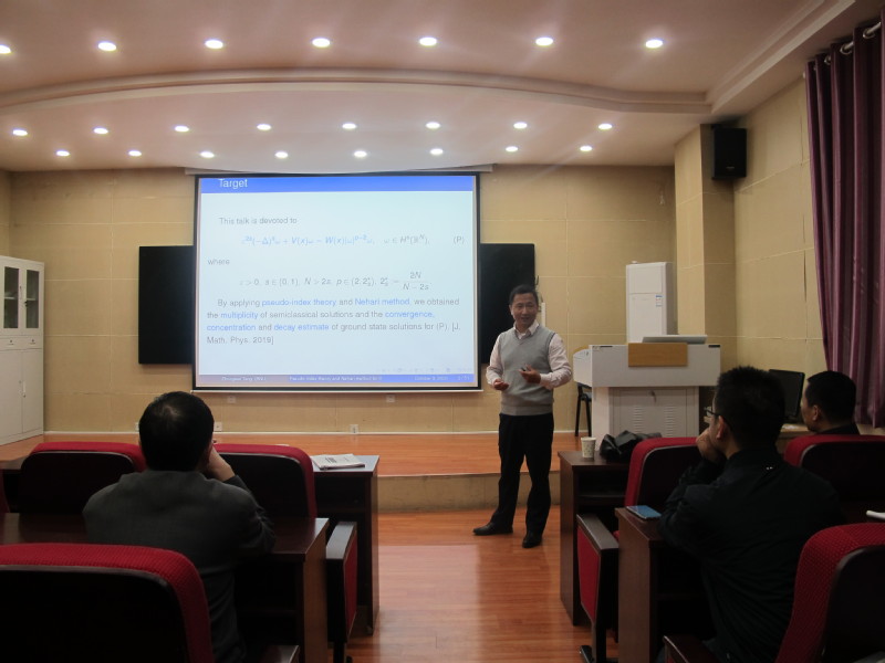 唐仲伟教授介绍了他与辽宁师范大学刘敏在有关非局部椭圆方程的解的多重性和集中性方面的工作,包括分数阶Schrodinger方程,Choquard方程和分数阶Choquard方程。基于Benci伪指标理论和Nehari方法证明了这三类方程的半经典解的多重性,包括正解、负解和变号解;又利用变分法研究了这三类方程的基态解的收敛性、集中性和渐近性。