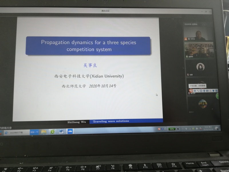 10月14日上午,应学院邀请,西安电子科技大学吴事良教授在线为我院师生作了题为《Propagation direction for the bistable traveling front in a three species competition system》的学术报告。报告会由学院张国宝教授主持,相关专业师生50余人在线观看了报告。