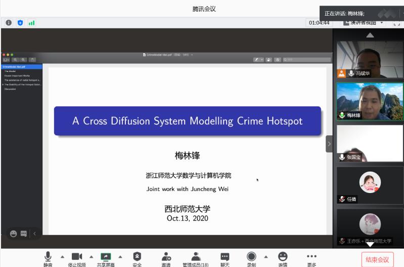10月13日,应学院邀请,浙江师范大学梅林锋教授在线为我院师生作了题为《Existence and stability of spike solutions for a chemotaxis system modelling crime pattern formation》的学术报告。报告会由冯斌华副教授主持,相关专业师生50余人参加了此次报告会。