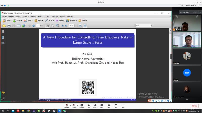 10月15日下午,应学院邀请,北京师范大学郭旭教授在线为我院师生作了题为《A New Procedure for Controlling False Discovery Rate in Large-Scale t-tests》的学术报告。报告会由田玉柱副教授主持,统计学专业师生20余人参加了此次报告会。