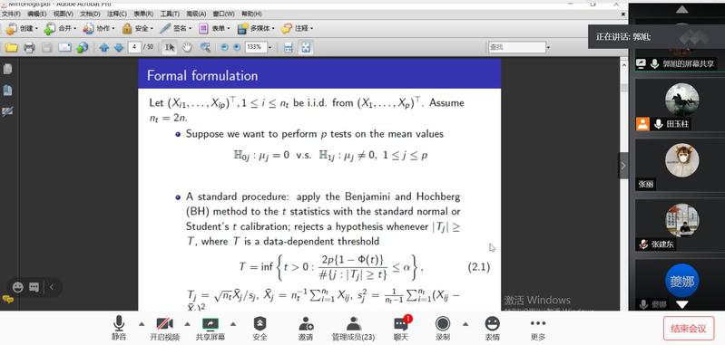 报告中,郭旭教授首先简单介绍了多重检验中FDR的概念,并用样本数据对称或非对称情况下的样本随机分割成2组后的t检验统计量的乘积构造了一个新的统计量来计算FDR,并将其考虑到单边检验、双边检验、特征选择及高维回归模型中,得到了比以往检验方法更有效的结果。报告过程中,郭旭教授还与部分师生就相关问题作了在线交流。