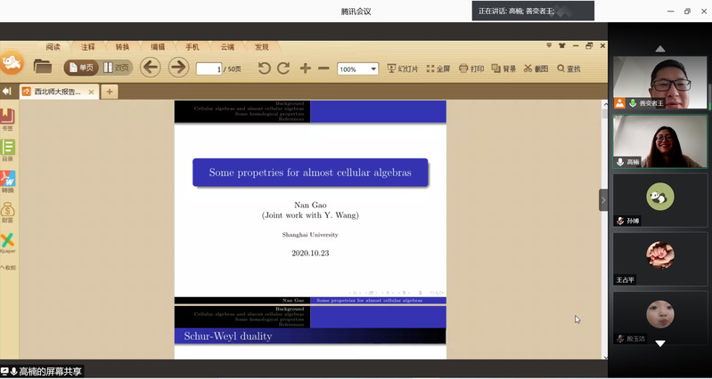 10月23日,应学院邀请,上海大学数学系高楠教授,在线为我院师生作了题为《Some propetries for almost cellular algebras》的学术报告。报告由狄振兴副教授主持,相关专业师生40余人参加了学术报告。