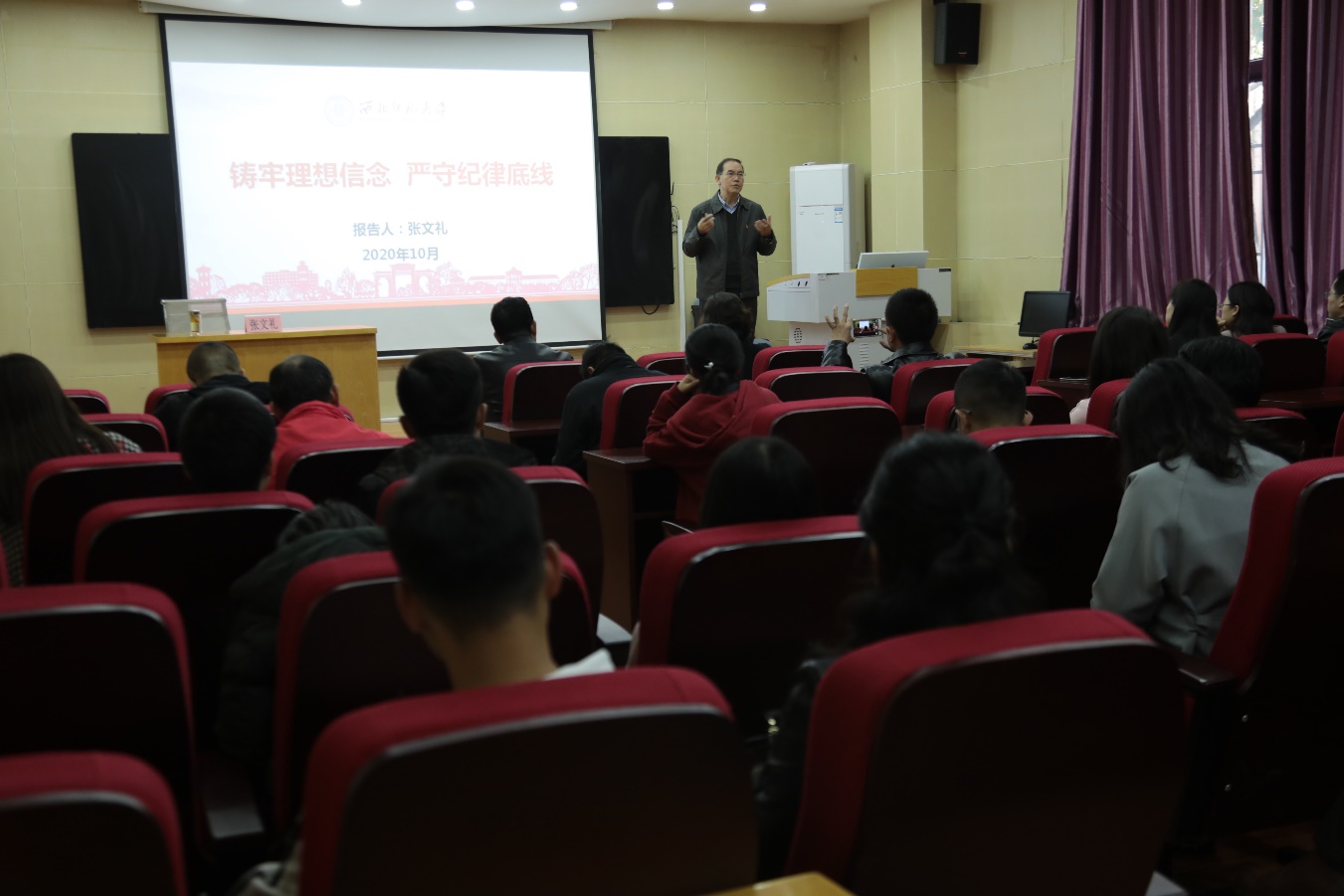 报告会上,张文礼教授围绕“什么是共产党人的理想信念”“为什么要坚定理想信念”“如何才能坚定理想信念”阐释了理想信念的深刻内涵;围绕“什么是党的纪律”“纪律严明是中国共产党的鲜明特征和一贯要求,是中国共产党的政治基因”“‘从严治党’到‘全面从严治党’”“认清全面从严治党的新形势——知敬畏、存戒惧”“准确把握纪律要求——守底线、讲规矩”等方面解读了党的纪律和从严治党的丰富内涵,并结合典型事例和案件论述了遵守党纪党规的重要性,号召全体党员和教师坚定理想信念,坚守纪律底线,廉洁从业,争做“四有好老师”,不忘初心,牢记使命,为培养德智体美劳全面发展的社会主义建设者和接班人作出新的贡献。