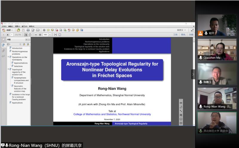11月7日下午,应学院邀请,上海师范大学王荣年教授在线为我院师生作了题为“Aronszajn-type Regularity for Nonlinear Evolution Equations with Multi-valued Perturbations”的学术报告。报告会由杨和副教授主持,相关专业师生30余人参加了报告会。
