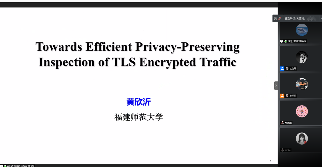 11月17日下午, 应学院邀请, 福建师范大学黄欣沂教授在线为我院师生作了题为《Towards Efficient Privacy-Preserving Inspection of TLS Encrypted Traffic 》的学术报告。报告会由学院杜小妮教授主持, 相关专业师生50余人在线收听了报告。