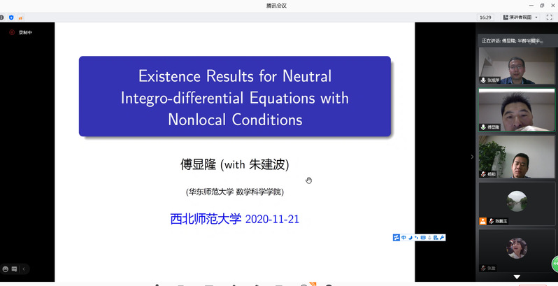 11月21日,应学院邀请,华东师范大学傅显隆教授在线为我院师生作了题为《Existence Results for Neutral Integro-differential Equationswith Nonlocal Conditions》的学术报告。报告会由陈鹏玉副教授主持,相关专业师生40余人参加了此次报告会。