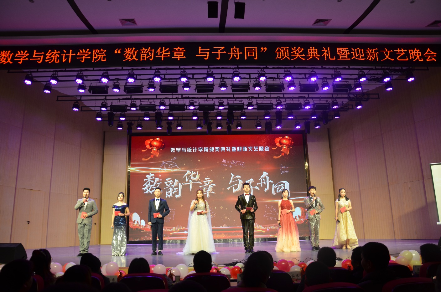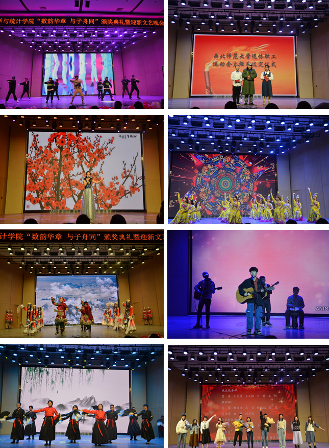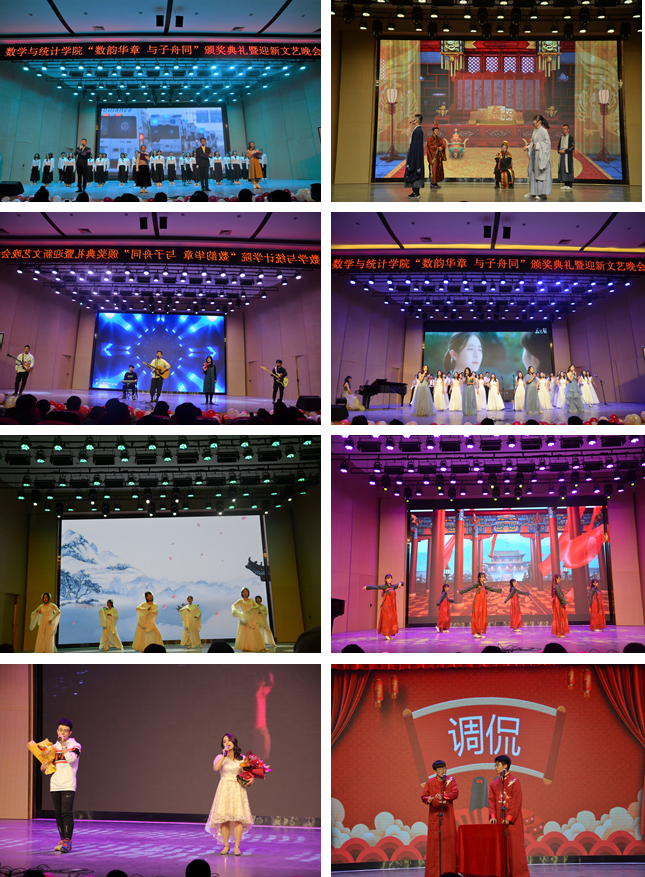 晚会以“数韵华章 与子舟同”为主题,伴乐诗朗诵《在一起》充分展示了全国人民在抗击新冠肺炎疫情中所形成的“生命至上,举国同心,舍生忘死,尊重科学,命运与共”的伟大抗疫精神;激情澎湃的乐队表演《生命因你而火热》《你都忘了你有多美》《你是人间四月天》,带观众走进了一个充满精彩和美好的生活世界;古风舞蹈《烟雨行舟》《雁归来》则将“凭栏孤伞舟前立,风吹杨柳细”和“浩气长存贯八面,傲气长存走四方”的古风古韵展现的淋漓尽致;现代舞蹈《Good boy》尽显数统学子多才多艺、风华正茂朝、气蓬勃的精神风貌;维吾尔族舞蹈《那孜库姆》、苗族和藏族舞蹈串烧《民族舞魂》、苏丹留学生舞蹈《Sudan culture》充分展现了民族团结、睦邻友好的家国情怀;独唱《红梅赞》、合唱《“星”的甜蜜》、歌曲串烧《乘风破浪》更是将晚会推向高潮;小品《火炬手》、话剧《皇帝与刺客》、相声《调侃》引得观众爆笑不断、掌声阵阵。最后,晚会在师生共同演唱的歌曲串烧《来日纵是千千晚星》中圆满落下帷幕。