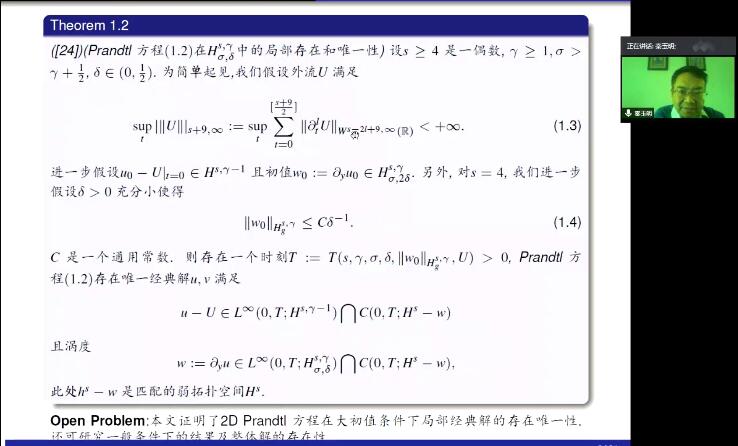 12月12日上午, 应学院邀请,东华大学秦玉明教授在线为我院师生作了题为《Prandtl方程研究进展》的学术报告。报告会由学院马巧珍教授主持,相关专业师生30余人在线收听了报告。