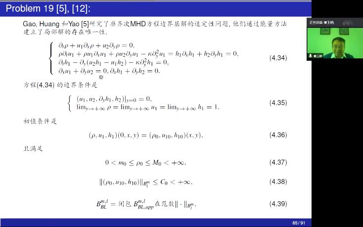 秦玉明教授首先介绍了MHD方程的研究背景,并从二维MHD方程、三维MHD方程、其他边界层方程等方面对MHD方程进展详细介绍,并详细讲解了研究思路、方法以及目前的研究成果。最后秦玉明教授分享了在该领域做科学研究和研究生培养的经验和思路,鼓励研究生积极探索新的研究领域,拓宽研究范围,取得新的研究成果。