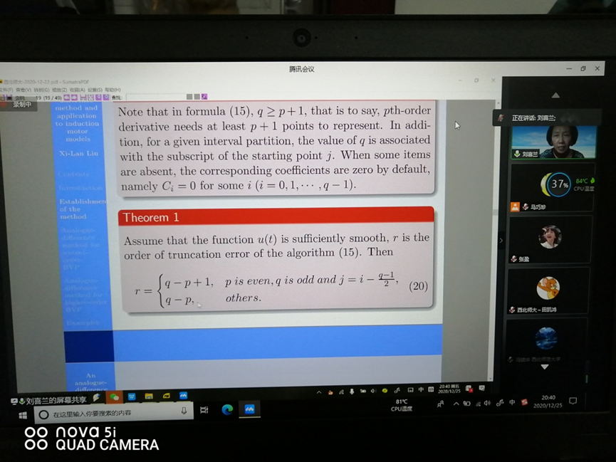 12月25日,应学院邀请,宝鸡文理学院刘喜兰教授在线为我院师生作了题为《微分方程数值计算》的学术报告。报告会由学院刘建成教授主持,马巧珍教授组织,相关专业师生30余人在线收听了报告。
