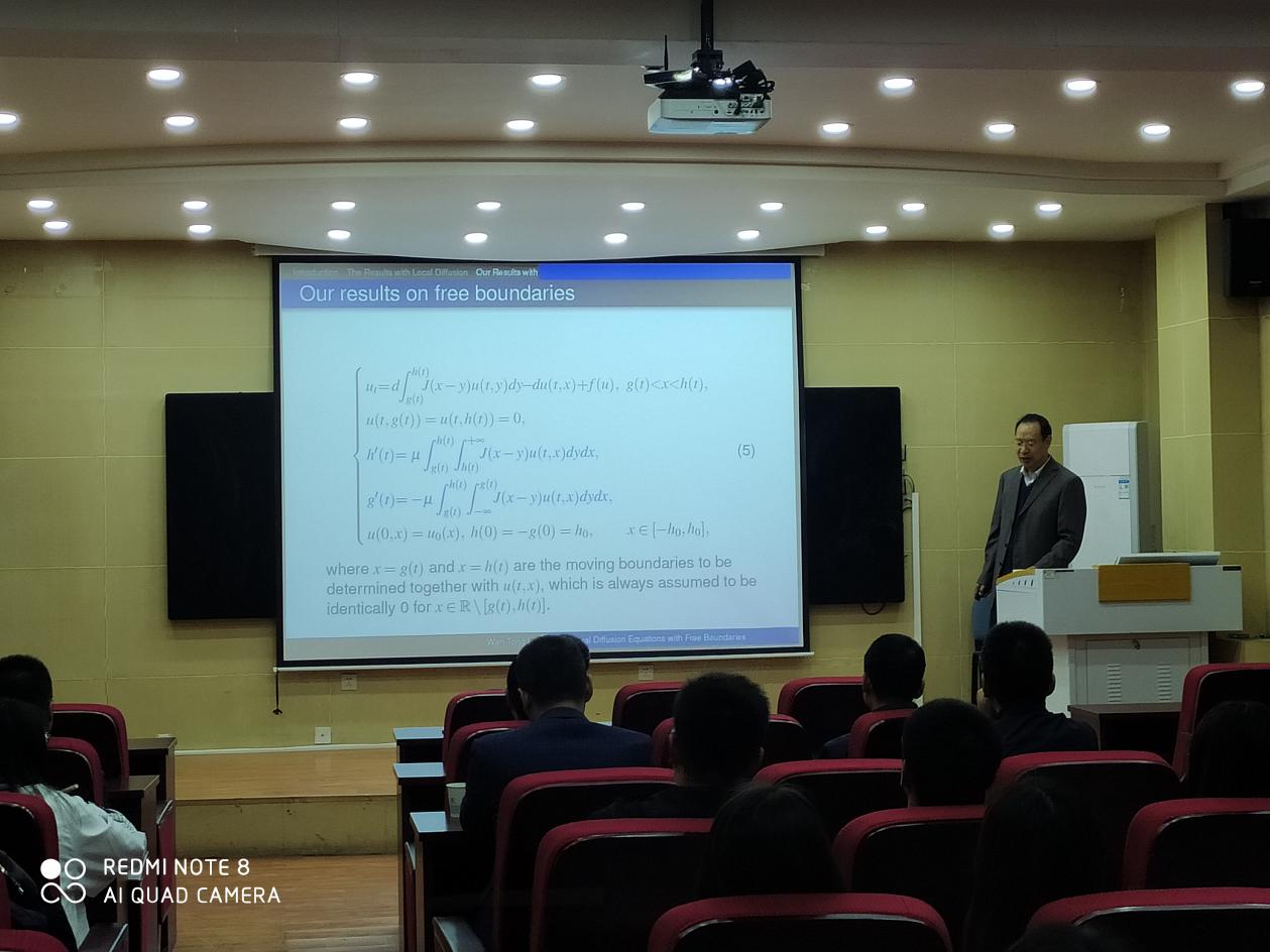 李万同教授主要汇报了非局部扩散自由边界问题的传播动力学的研究,首先介绍了解的全局存在唯一性,然后介绍了反应项为Fisher-KPP型时解的长时间行为。最后,作为应用,详细介绍了具有自由边界的非局部L-V竞争模型和传染病模型的动力学行为。