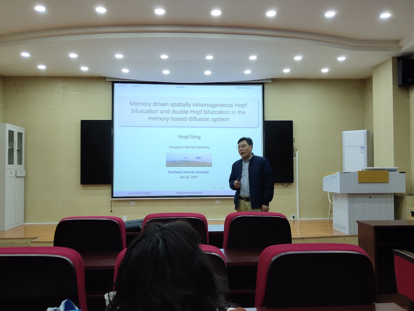 4月25日,应学院邀请,杭州师范大学“钱江学者”特聘教授宋永利为我院师生作了题为《反应扩散方程的分支理论及斑图动力学》的学术报告,相关专业师生50余人参加了报告。