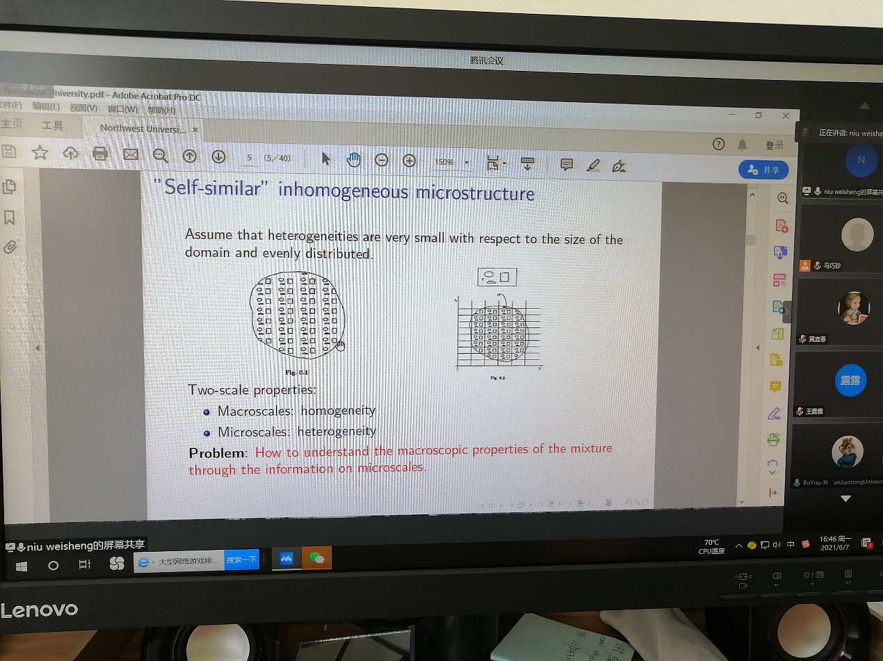 6月7日下午, 应学院邀请, 安徽大学教授、博士生导师钮维生在线为我院师生作了题为《Combined Effects of Homogenization and Singular Perturbations》的学术报告。报告会由学院马巧珍教授主持, 相关专业师生30余人在线收听了报告。